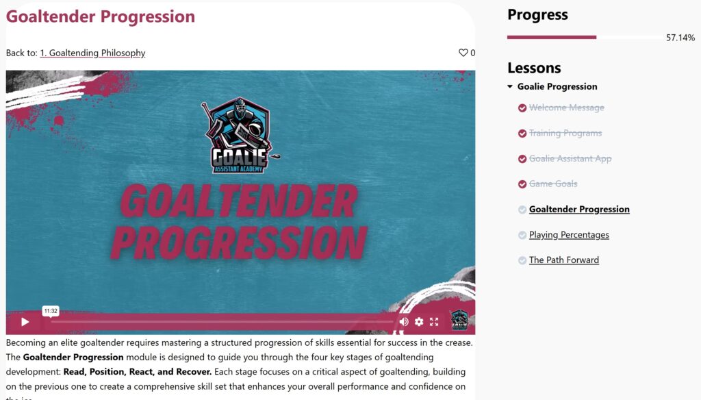 “Every lesson builds on the last — giving goalies a clear path from fundamentals to advanced play.”